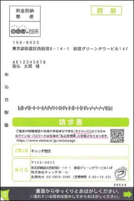 - 当店にかわり、後払い.com運営会社の(株)キャッチボールより請求書が送られます。